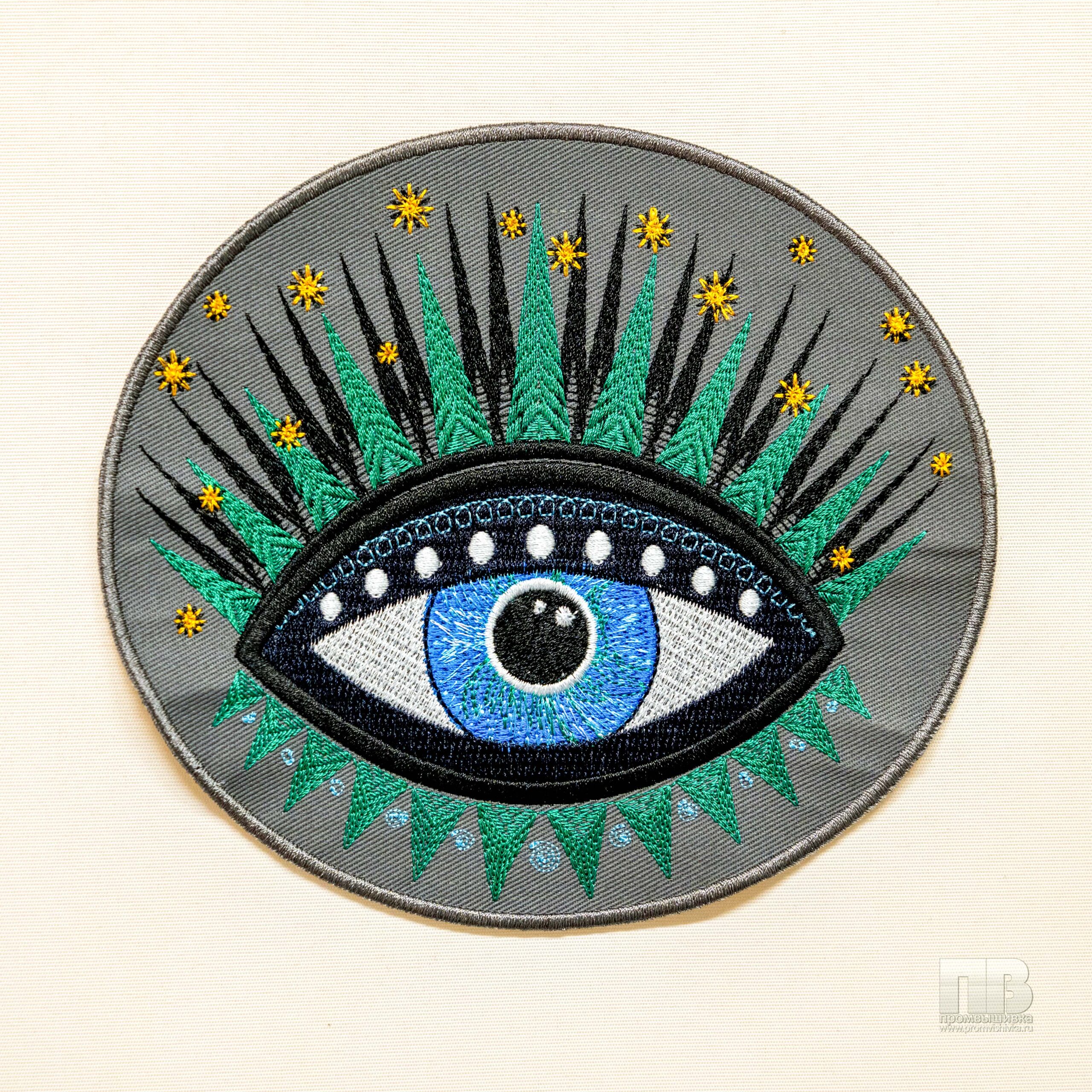 Серая овальная нашивка с шаманским глазом — это целая вселенная, вышитая нитями. Голубой глаз, ясный …