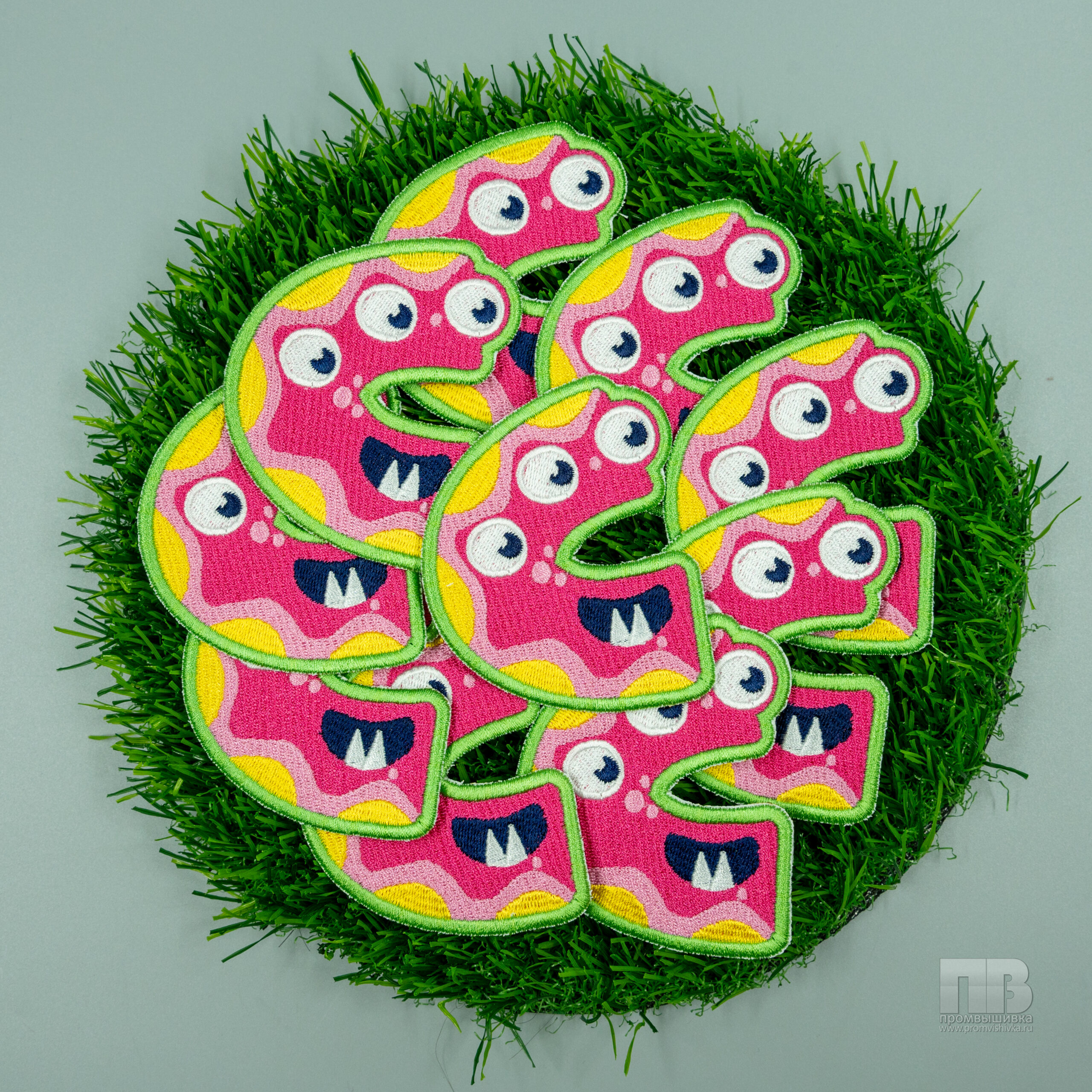 Насыщенно-розовая буква «С» с тремя глазами, острой зубчатой улыбкой и фантазийными гребнями — эти нашивки …